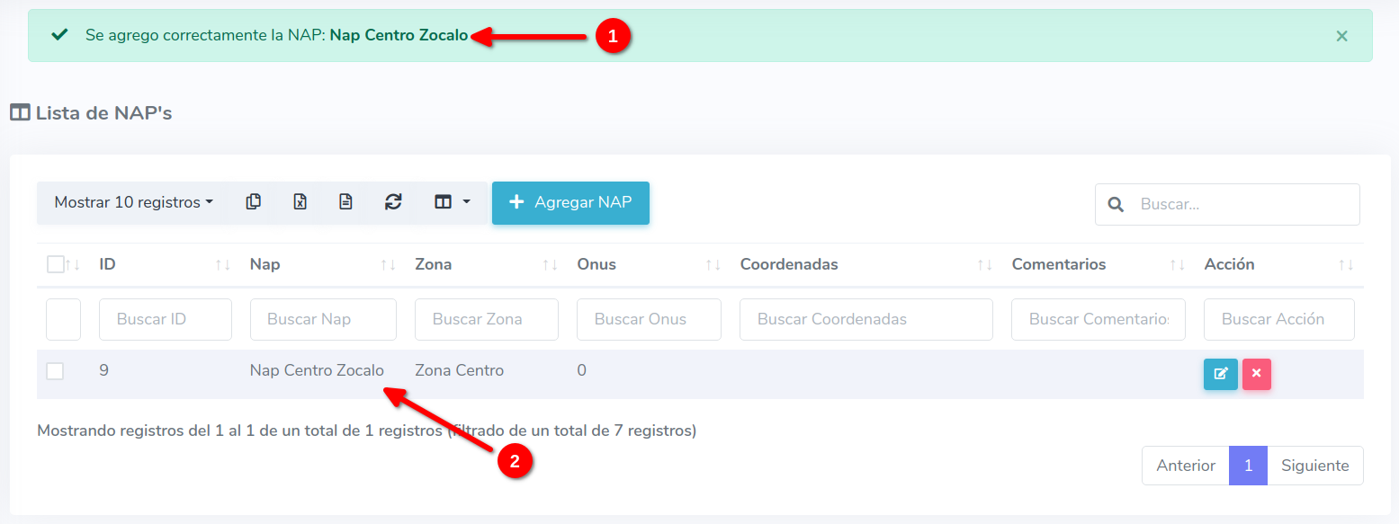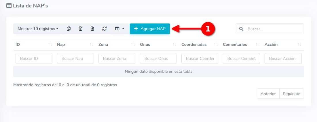 2Una vez en la lista de Nap's. Esto nos mostrara una lista con todas las Nap's con las que contamos actualmente en AdminOLT. Para agregar una nueva Nap debemos seleccionar la opción "Agregar Nap".