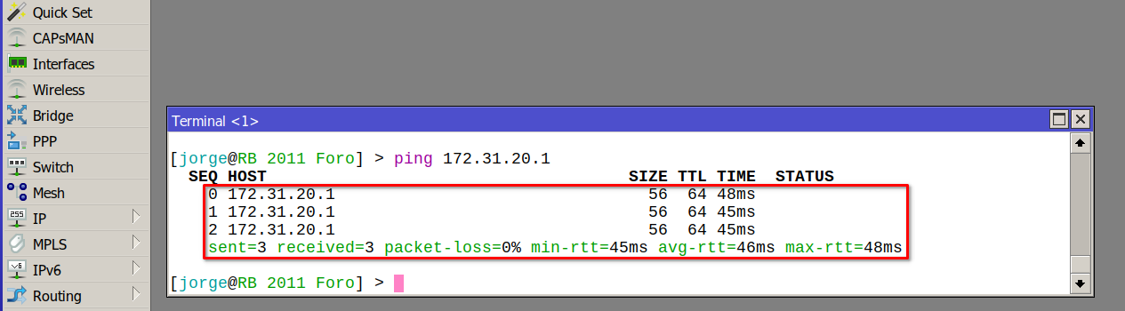 5Verificar conexión. Al pegar el script de conexión en nuestro router, debemos aplicar un ping a la IP 172.31.20.1 para comprobar la correcta comunicación.