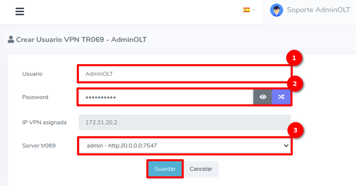 2Ahora se nos mostrará un formulario donde le asignaremos un usuario, contraseña y a cuál servidor será asignado y agregado. Una vez hecho esto debemos seleccionar la opción guardar. Esto agregará el Usuario VPN TR069 al sistema y al Servidor TR069 para poder usarlo.