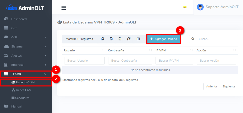 1Para poder agregar un Usuario VPN TR069, debemos dirigirnos a la sección TR069 > Usuarios VPN y le damos click al botón Agregar Usuario.
