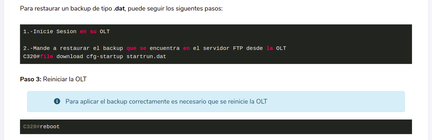 Lo siguiente es seguir los comandos a escribir en la terminal de su OLT dependiendo de que tipo sea el respaldo