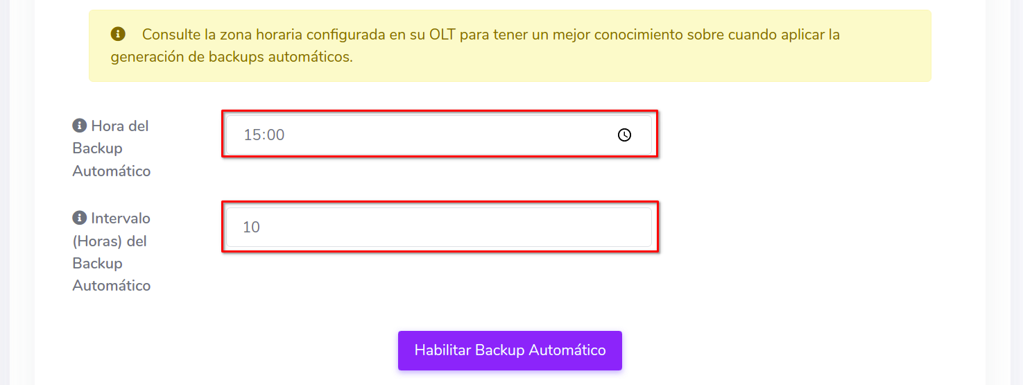 - Hora del Backup Automático: Seleccione la hora en un formato de 24 horas
