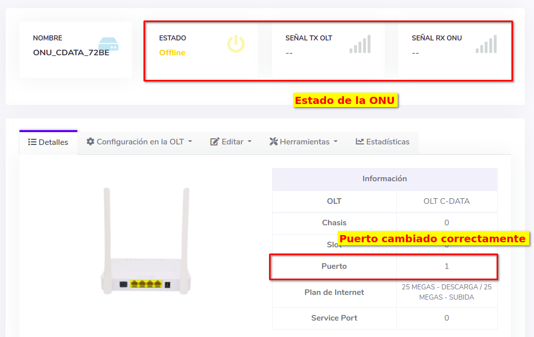 En este momento si vemos el estado de la ONU, este se encuentra en Offline debido a que físicamente no sé ha cambiado la ONU de Puerto, pero en AdminOLT si se ha actualizado la información.