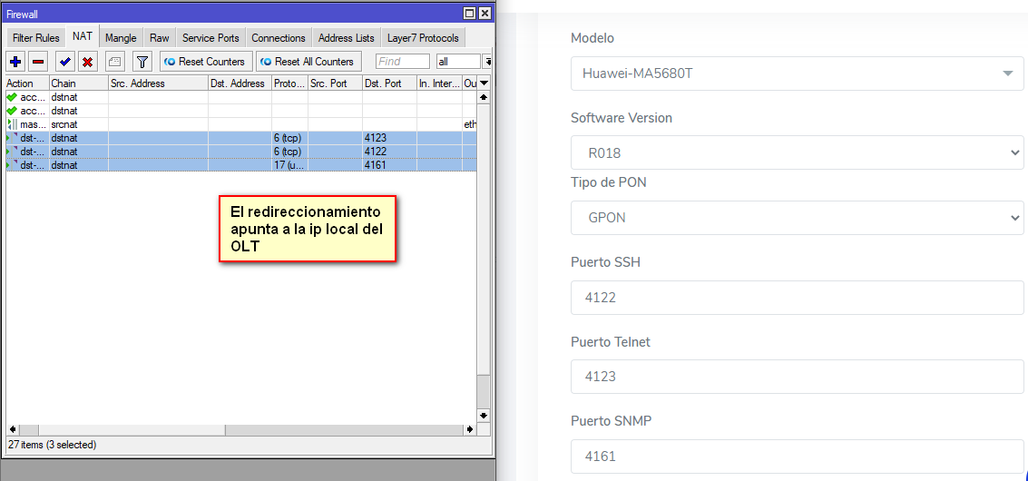 Con apuntar a la misma IP de VPN no es suficiente, necesitamos que nuestra conexión puede identificar cuando tratemos de conectarnos con una de las OLT. La forma en como AdminOLT identifica esto es mediante el redireccionamiento de puertos.