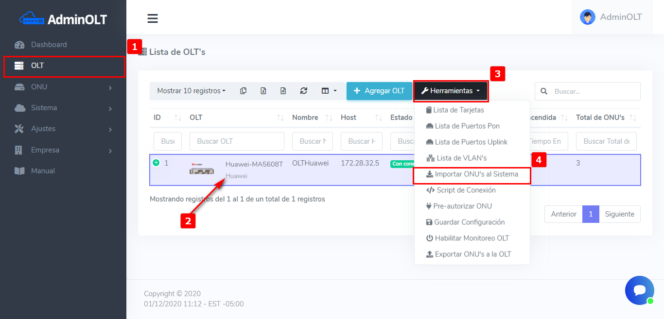 1Nos dirigimos al menú de OLT donde seleccionaremos el equipo al cual vamos a importar las onu’s y abrimos la caja de Herramientas para poder seleccionar la opción de Importar ONU’s al Sistema