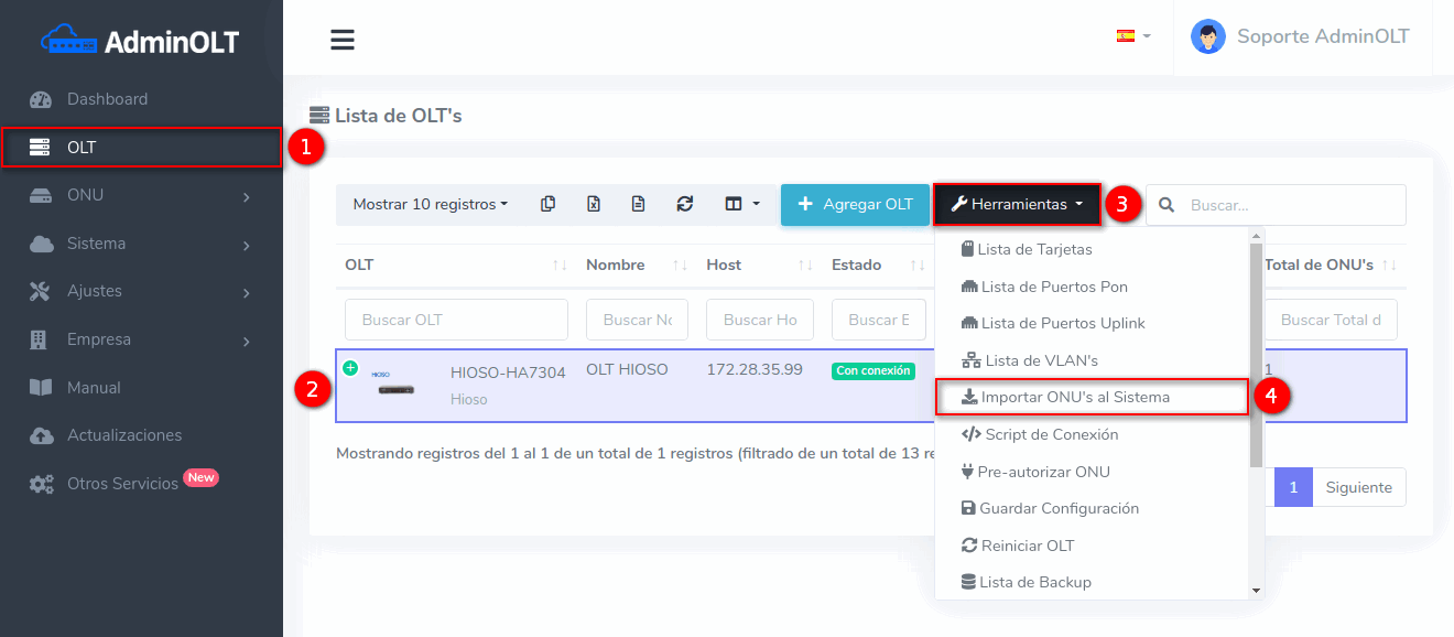 1En la Lista OLT's seleccionamos el equipo con el que trabajaremos para después ir a Importar ONU's al Sistema, que se encuentra en el botón con la leyenda Herramientas.