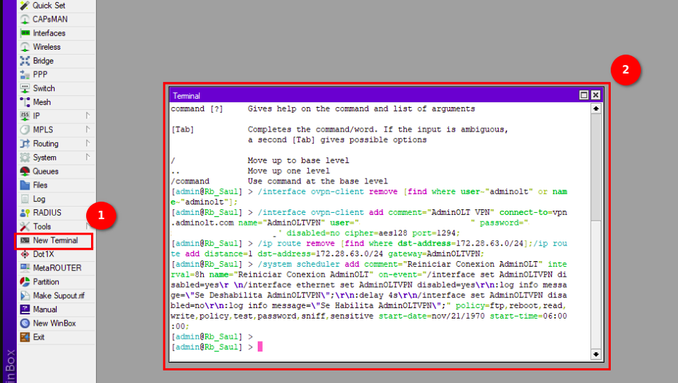 4 En la terminal de su Routerboard pegamos el script generado por AdminOLT y verificamos la conexión.
