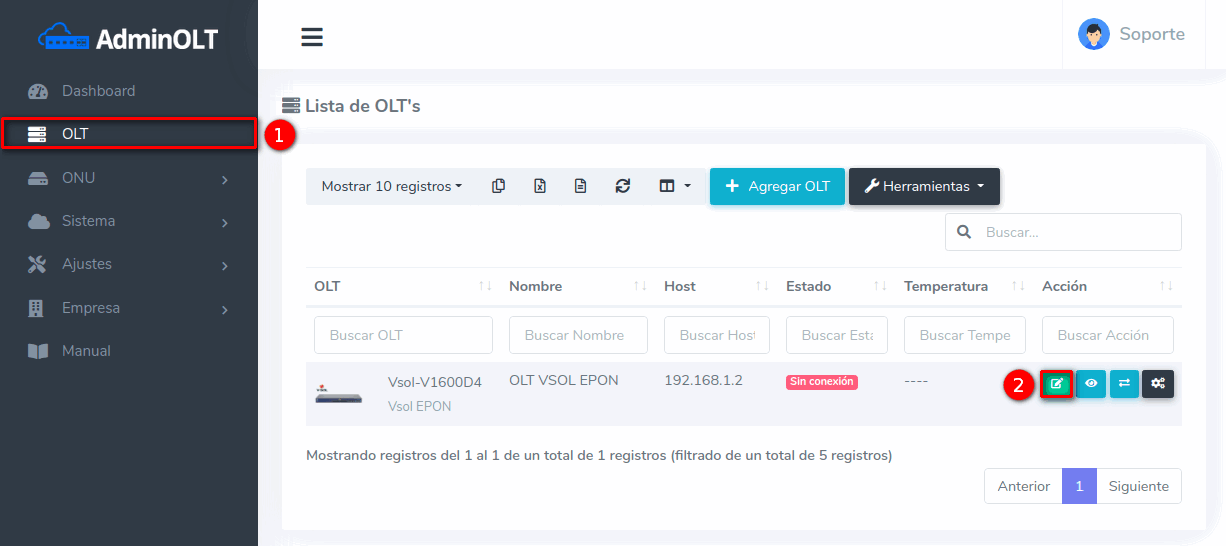 1En la Lista de OLT's seleccionamos el equipo que deseamos conectar. La OLT ya debe estar registrada en AdminOLT.