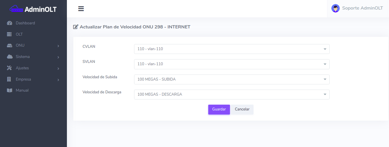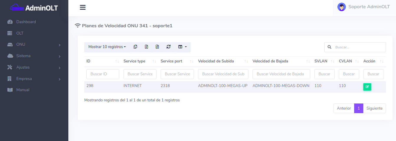 Una vez autorizada la ONU podrán ser modificados sus planes de velocidad y vlans asociados a los servicios desde la lisa de planes de velocidad.