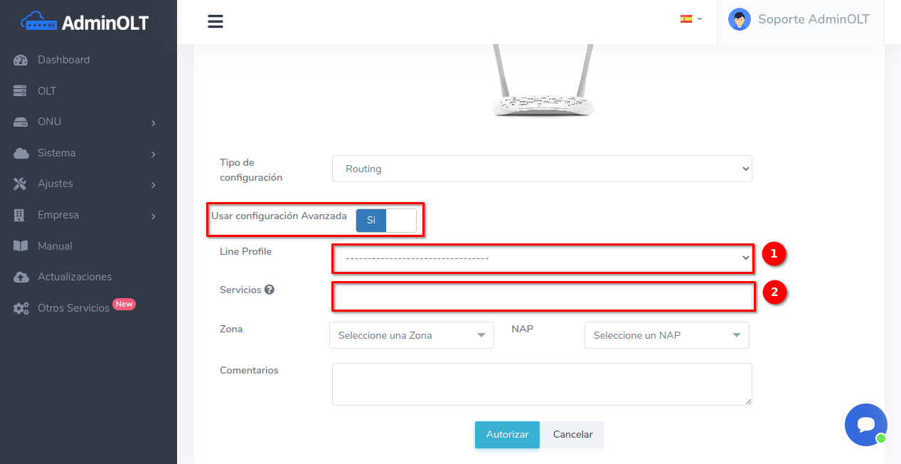 Pasos para autorizar onus utilizando configuración avanzada