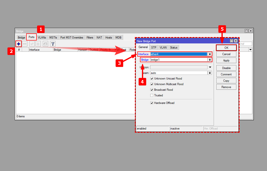 1 Nos dirigimos al apartado de Bridge en el menú de nuestro RouterBoard para crear la interfaz bridge1 y así poder agrupar los puertos que estarán trabajando en la red de la OLT.