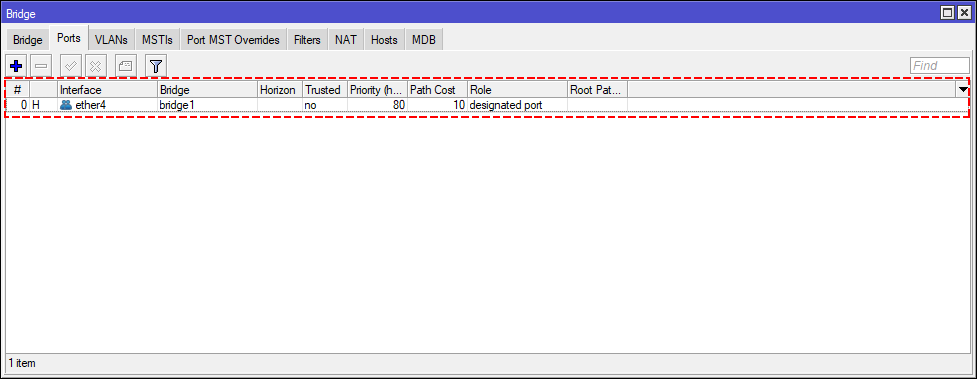 1 Nos dirigimos al apartado de Bridge en el menú de nuestro RouterBoard para crear la interfaz bridge1 y así poder agrupar los puertos que estarán trabajando en la red de la OLT.