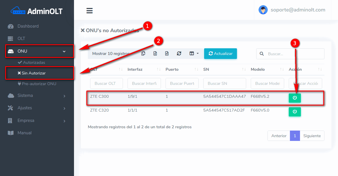1Dirijase a la sección de ONU > Autorizadas y seleccione la ONU con la que desea trabajar.