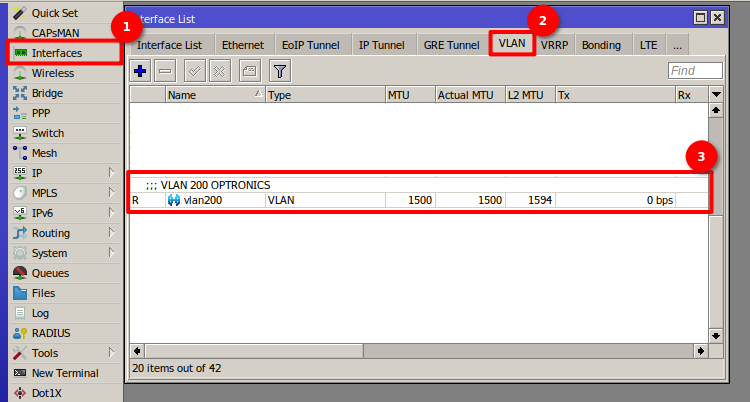 1 Para esto debemos dirigirnos en mikrotik a la sección de Interfaces > VLAN y agregar una VLAN con el puerto 200.