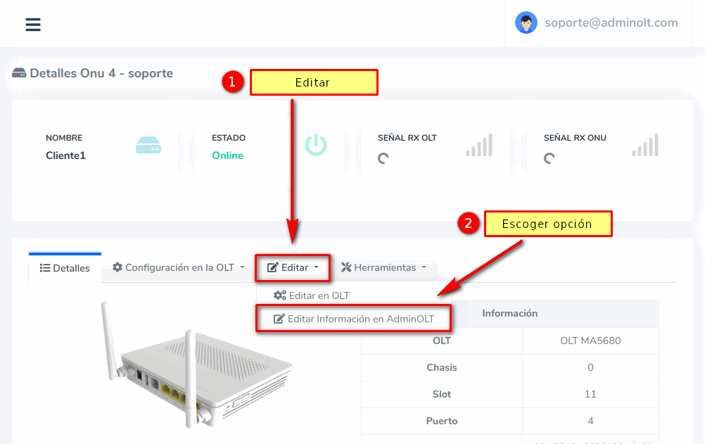 3 Vamos a Editar y escogemos Editar información en AdminOLT
