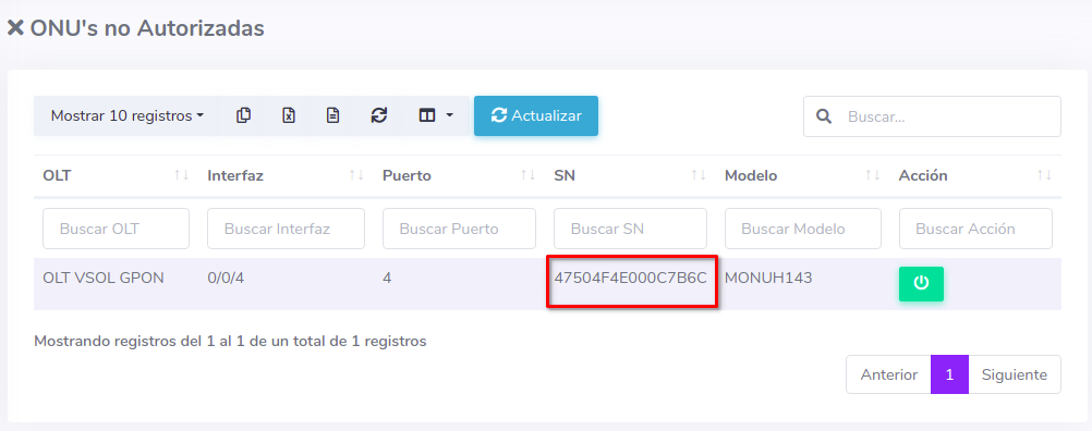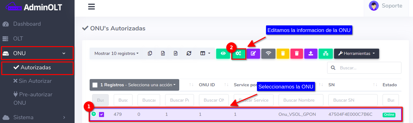 En AdminOLT podemos editar información de una ONU Autorizada en la OLT, supongamos que alguna de las ONUs que tenemos autorizadas en el sistema se estropea. Tomaremos como ejemplo esta situacion para explicar el propósito de esta función. Asi que en ese caso en AdminOLT al editar ONU por SN podemos tomar información de alguna ONU no Autorizada y usarla, sin perder la configuración inicial que teníamos.
