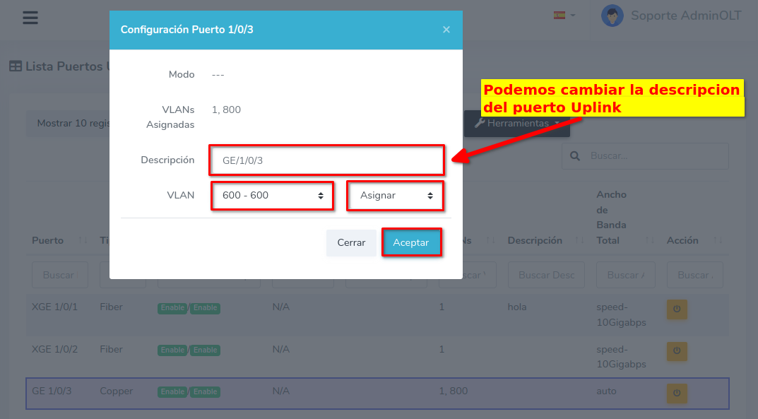 Puede escribir una descripción y escoger entre asignar o remover la VLAN