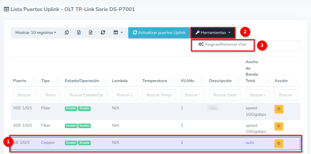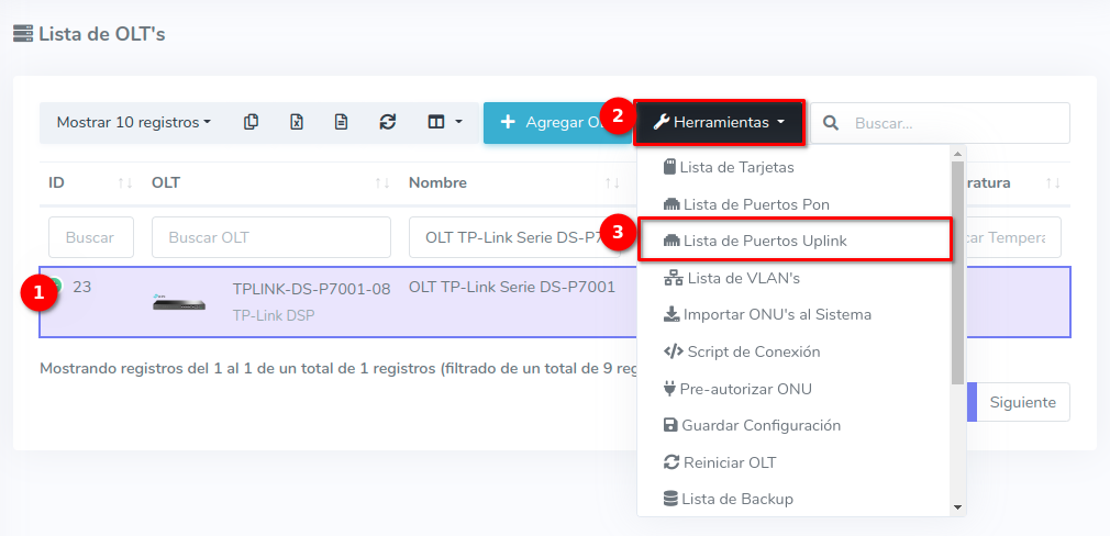 1 En la Lista OLT's seleccionamos el equipo con el que trabajaremos para después ir a Puertos Uplink, que se encuentra en el botón con la leyenda Herramientas.