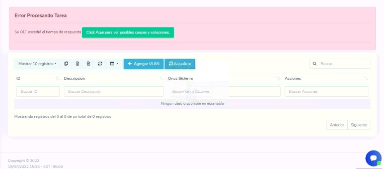 El error aparece cuando la OLT deja de mandar respuesta hacia el sistema por el protocolo SNMP que utilizamos en el sistema, esto no influye si la conexión que se tenga hacia el sistema es por VPN o por IP pública, la respuesta es la misma para ambos casos.