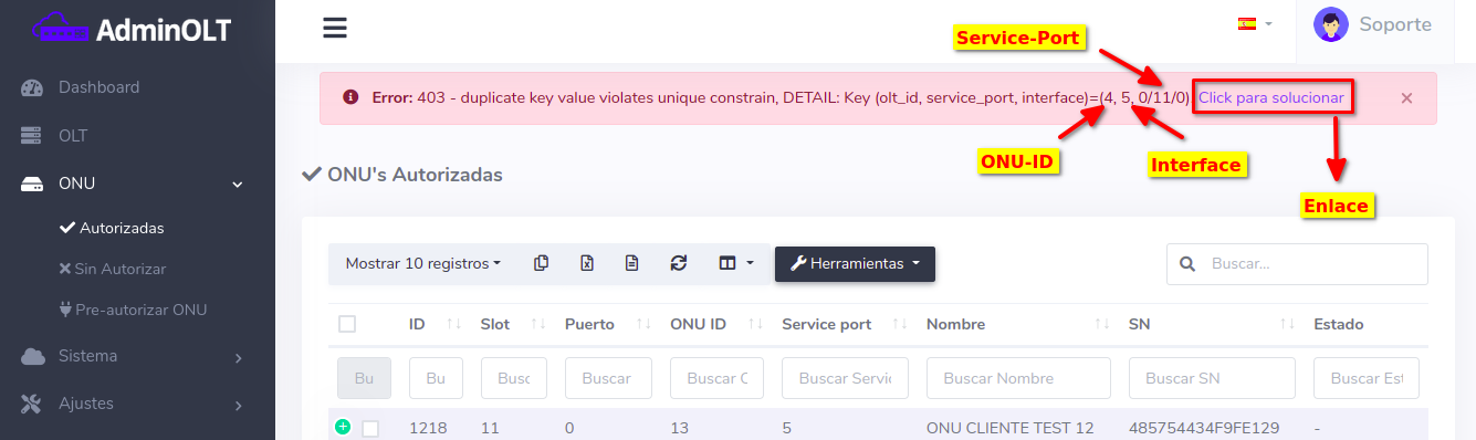 Si elimina la ONU de la lista de autorizadas y no de la OLT (es posible eliminar la ONU solo de AdminOLT y dejarla autorizada en la OLT), al intentar autorizar ese equipo nuevamente en algún otro puerto no sera posible, ya que la OLT ya tiene registrado el SN.