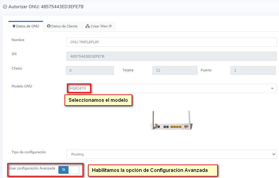 Autorizamos la onu y habilitamos la opción de configuración avanzada