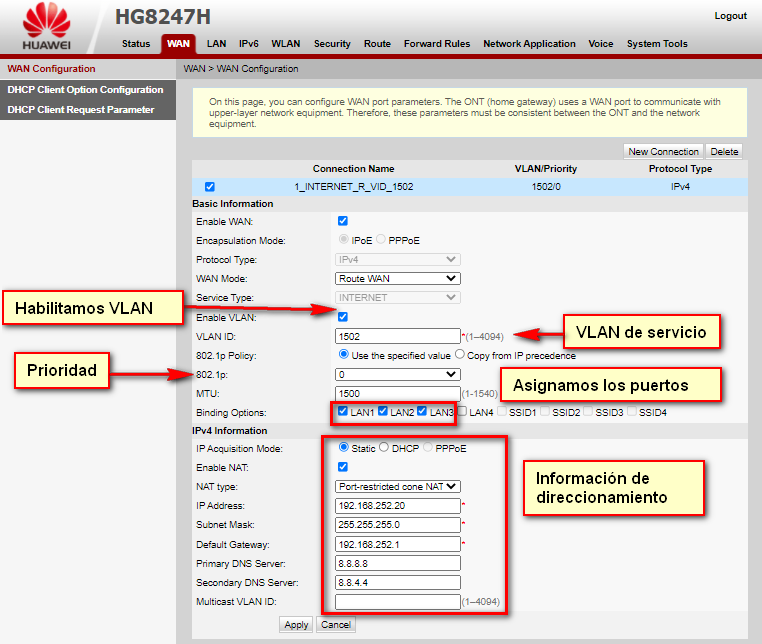 Para la creación de la WAN IP de INTERNET usaremos la siguiente información