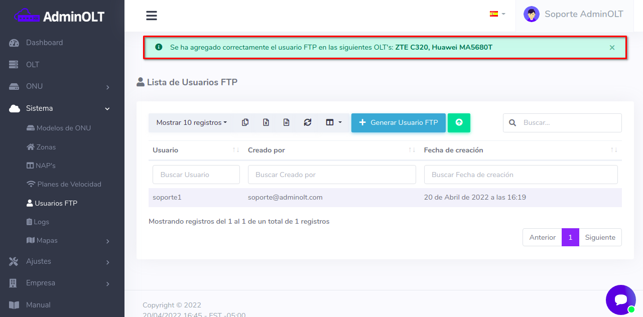 ¿Cómo creo un usuario FTP en el sistema AdminOLT?